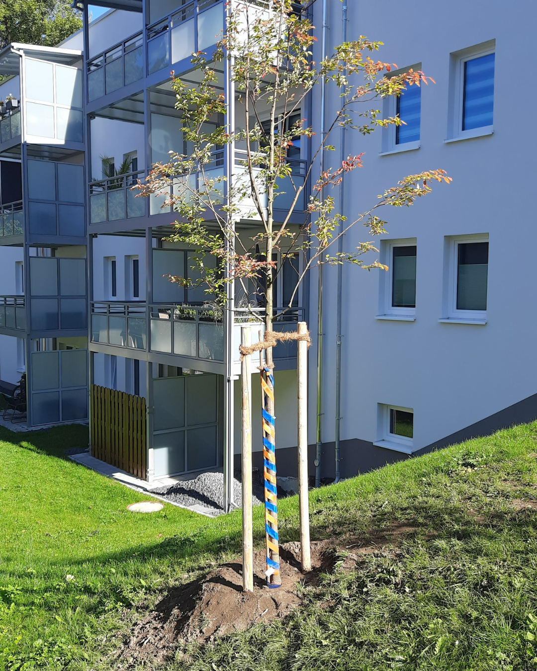 Die Felsenbirne stehe für Beständigkeit, so Wifög-Chef Stephan Horn bei der Übergabe. Er wünsche der Wohnbau damit weiterhin auch für die nächsten Jahrzehnte viel Erfolg und Wachstum. Das blau-orangefarbene Band, das den noch dünnen Stamm des jungen Baumes ziert, symbolisiere das gute und enge Miteinander der beiden Unternehmen, die ja auch nachbarschaftlich verbunden sind: Blau steht für die WiföG, Orange für die Wohnbau. Die WSCO sagt Danke!